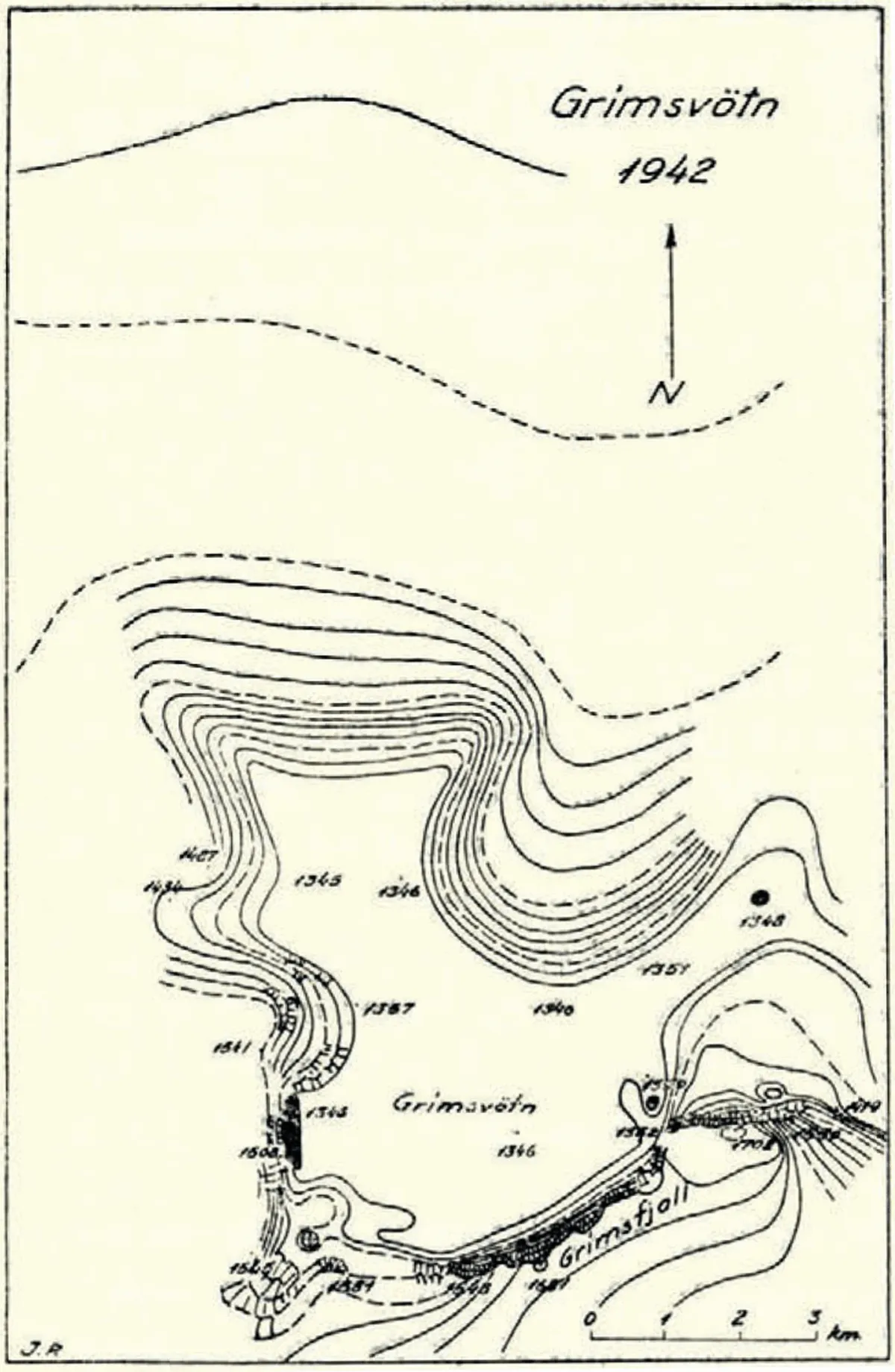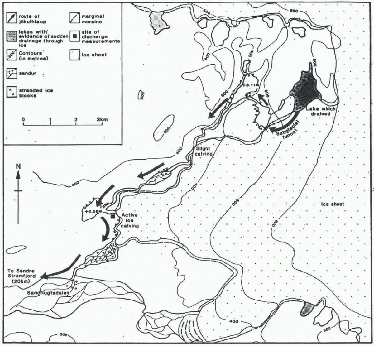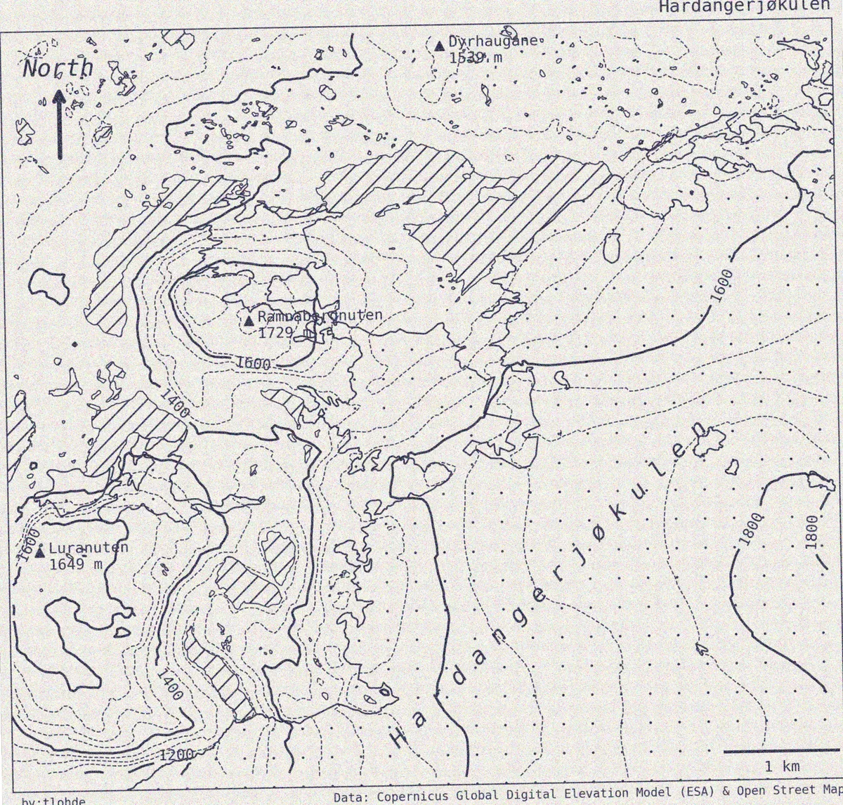 here i endeavoured to recreate the style found in old scientific publications, specifically those found in the Journal of Glaciology (e.g. sugden et al., (1985) & sigurudur thorarinsson (1953)). I particularly like thorarinsson's north arrow, and the way the contour lines abruptly stop at the point at which he decided they were no longer needed.