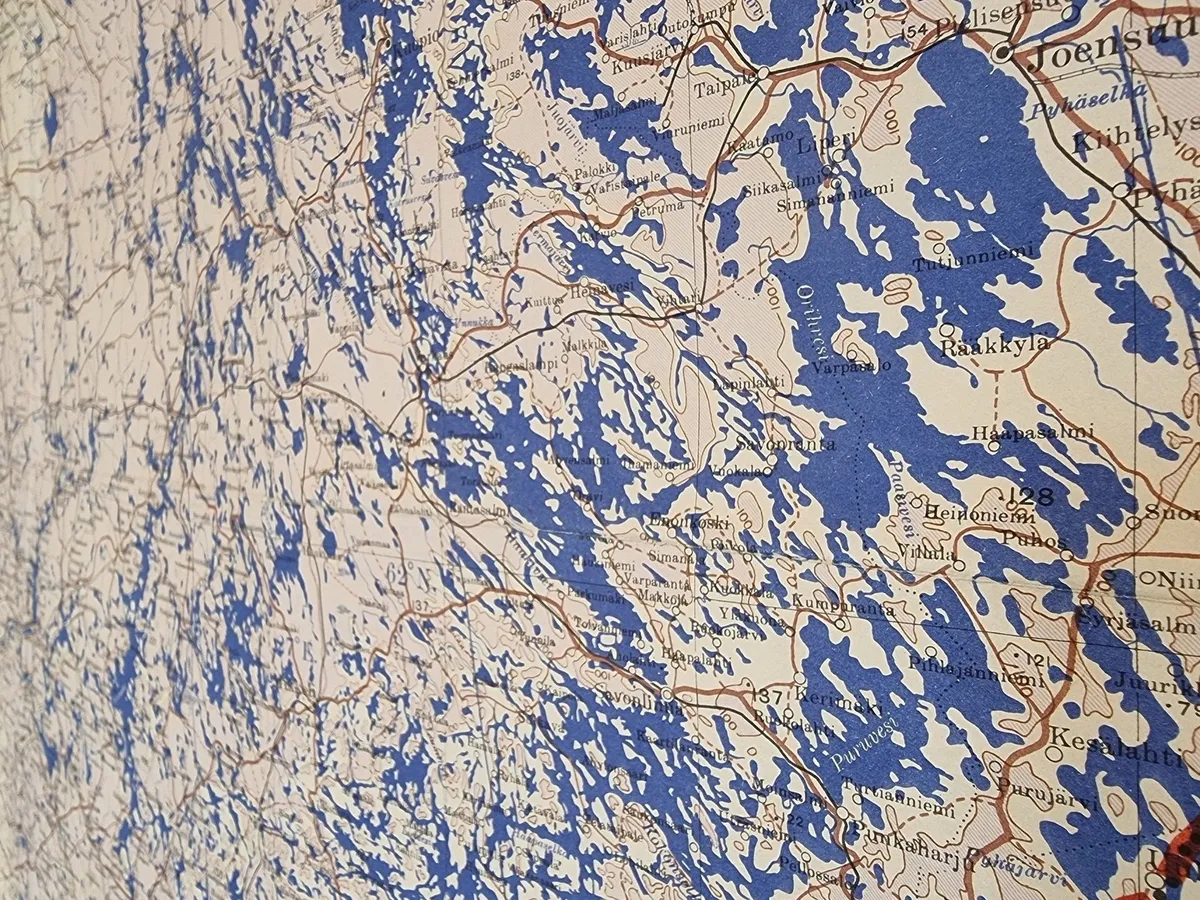 i chose Finnish lakes because: (a) there are lots of them; (b) i love this ↓ map published by the war office in 1945 (2nd edition, 1948). i picked it up from a table on broadway market (i think) in ~2013 (maybe) for £3 (according to the pencil scribble at the top).