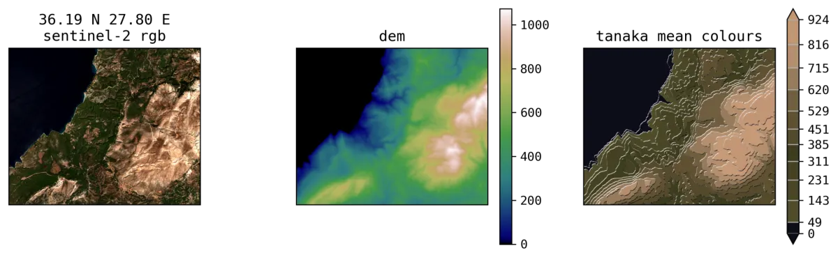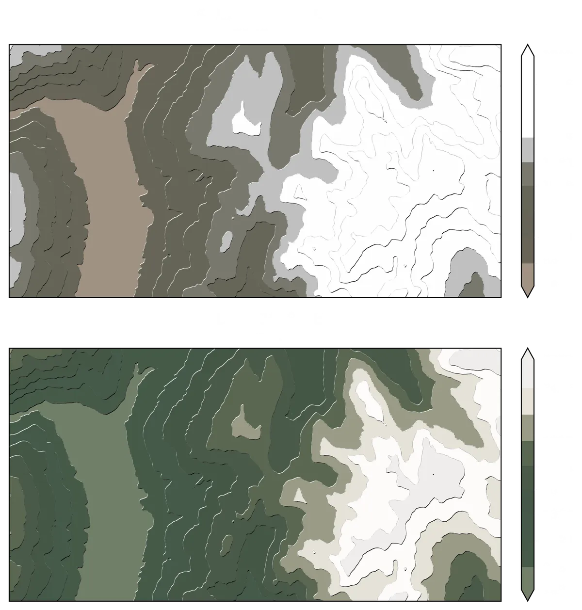 i had the thought when first doing this, but didn’t bother to actually do it. but that wasn’t good enough. so, here (fig 3) is the same area, with the same elevation bins, coloured in with the colours of late winter and summer.
